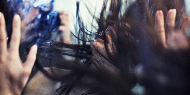 Woman in the throes of passion holding her hands up against a glass surface