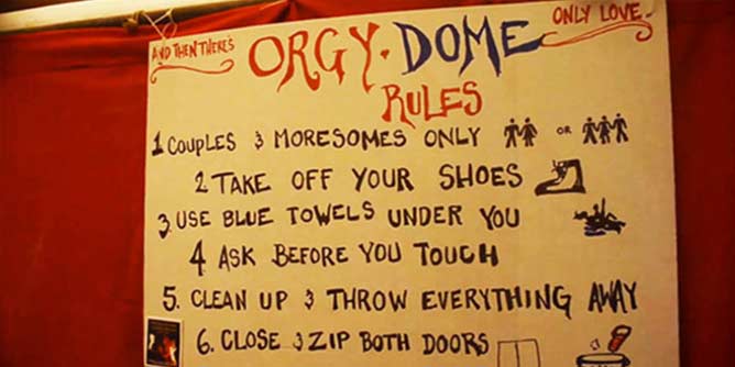 As well as old-fashioned orgies, the Orgy Dome is fully equipped with massage tables, mattresses lining the walls, sheets, couches and supplies including lubricants and condoms.